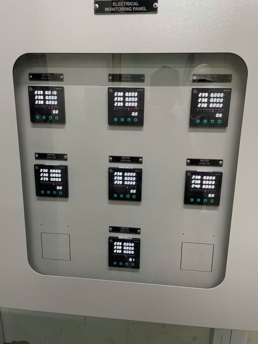 Song song đó, các đồng hồ đo dòng điện được lắp đặt trên tủ điện giám sát tổng, cho phép theo dõi liên tục điện áp và cường độ dòng điện của từng khu vực. Hệ thống hiển thị trực quan giúp bộ phận vận hành dễ dàng kiểm tra thông số theo thời gian thực, góp phần ngăn ngừa sự cố và nâng cao hiệu quả quản lý năng lượng.